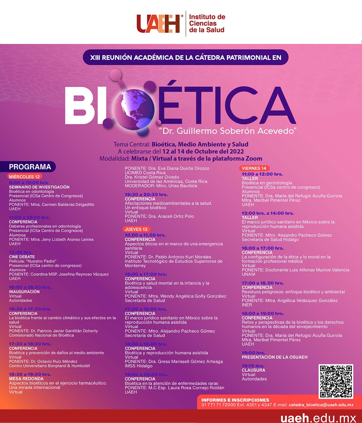 Para mayores informes e inscripciones puede llamar al número de conmutador 771 71 720 00, a las extensiones 4301 y 4347, o escribir al correo: catedra_bioetica@uaeh.edu.mx