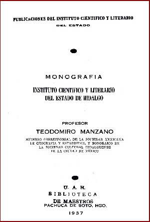 Escudriñar en la historia de nuestra Universidad es adentrarse en los testimonios escritos generados por el Instituto Científico y Literario, mas también es necesario recurrir a los estudios monográficos efectuados por historiadores que se dieron a la tarea de generar un conocimiento que hoy es una fuente de primera mano para el estudio histórico del primer establecimiento de educación superior en la entidad. Ejemplo de lo anterior es la monografía que elaboró el profesor Teodomiro Manzano, misma que lleva por nombre Instituto Científico y Literario del Estado de Hidalgo, publicada en 1937.