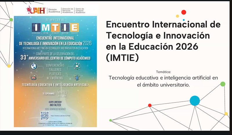 Mineral de la Reforma, Hidalgo. – El Centro de Cómputo Académico (CECA) de la Universidad Autónoma del Estado de Hidalgo (UAEH) invita a docentes e investigadores a participar en el Encuentro Internacional de Tecnología e Innovación en la Educación (IMTIE), por sus siglas en inglés 2026, que se realizará el martes 28 de abril en el Centro de Extensión Universitaria (Ceuni).