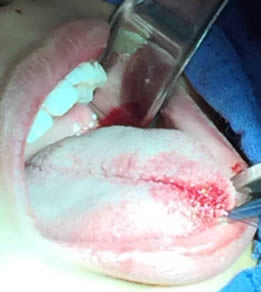 • Se pasa una sutura sin anudar en la punta de la lengua para traccionar la misma y facilitar las maniobras quirúrgicas. Posteriormente se utilizan dos pinzas de mosco, una curva y una recta pinzando el frenillo en su borde superior e inferior para limitar sus bordes. Figuras 3 y 4.