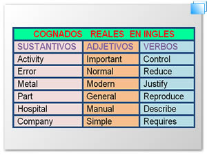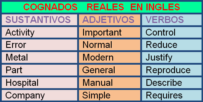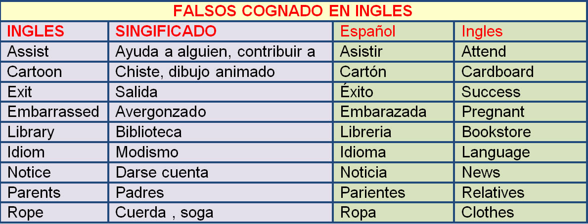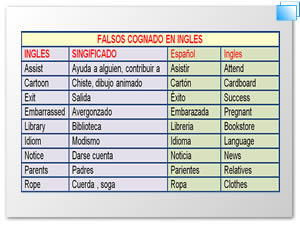 Los falsos cognados o falsos amigos reconocen un origen común el latín pero evolucionaron con significado determinado en inglés y con otro parcial o totalmente diferente en castellano. Estas palabras son muy parecidas en nuestro idioma pero tienen un sentido distinto y en ocasiones con sentido opuesto.