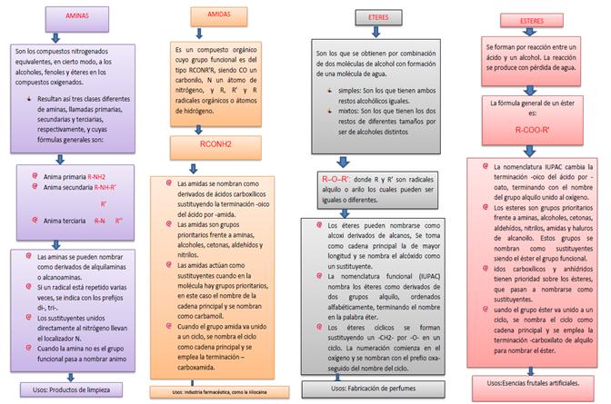 En el presente trabajó se realizó un esquema en donde se presentan las características principales, formulas generales, reglas de nomenclatura y usos de cada uno de los grupos funcionales, aldehídos, cetonas, ácidos carboxílicos, aminas, amidas, éteres y esteres, los cuales son los más importantes y representativos de la química orgánica.
