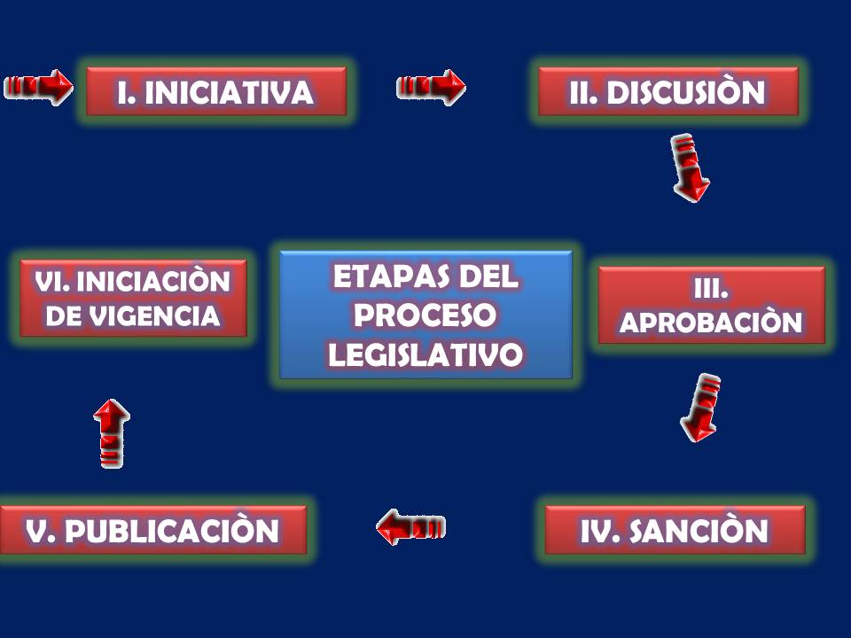 Etapas del Proceso Legislativo en México; el Congreso General (Poder Legislativo mexicano), es el órgano responsable de elaborar las disposiciones legales a través del procedimiento legislativo, donde se observan seis fases. I. Iniciativa.- Su fundamento Constitucional artículo 71 y 122, pueden presentar iniciativa de ley el presidente de la República, los Diputados, Senadores al Congreso de la Unión, Legislaturas de los Estados, Asamblea Legislativa caso del Distrito Federal. Consiste en la facultad de presentar proyecto de ley a la consideración del Congreso de la Unión, las Cámaras realizan deliberación donde su finalidad es de aprobar las leyes o no. II. Discusión.- Regulada por el artículo 72 Constitucional, interviene el Congreso de la Unión, cámara de Diputados, cosiste en que las cámaras discuten el proyecto de ley indistintamente. La Cámara de Origen conoce: de Empréstitos, Contribuciones, Reclutamiento de tropas. III. Aprobación.- Articulo 72 enciso A, intervienen Congreso de la Unión, Cámara de Diputados, Senadores, consiste cuando ambas cámaras aceptan un proyecto de ley, puede ser Aprobado parcialmente o totalmente. IV. Sanción.- Regulado por el artículo constitucional 72 enciso B, estriba en la autoridad de aprobación discrecional del proyecto del ejecutivo en el que puede ejercer sus Derecho de veto sobre cualquier ley, que consiste en una serie de observaciones que el ejecutivo realiza, No corrige el proyecto de ley. V. Promulgación y Publicación.- Fundamentado en el artículo constitucional 70, consiste en una declaración solemne donde se formaliza la incorporación definitiva al ordenamiento jurídico, y el presidente de la República procede a la publicación de la ley que entrara en vigor por medio de la publicación en el Diario Oficial de la Federación, que depende de la Secretaría de Gobernación. VI. Iniciación de vigencia.- Etapa en el cual empieza a regir la ley, intervienen las autoridades para hacer cumplir la ley, la población para cumplir la ley.